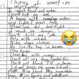 Gjërat që dua në familjen time. Dua bukë dhe ujë. Mos më gjuaj. Një shtëpi me ujë të rrjedhshëm dhe drita. Dua dashuri. Mami dhe babi që nuk zihen. Nuk dua drogë. Mos vrit kafshët e mia shtëpiake. Ndihmë me mësimet. Rroba të pastra të lezetshme. Jo morra. Jo buburreca. Shtëpi të pastër. Krevat të pastër me mbulesa. Mos shit lodrat e mia. Trajtim të përshtatshëm. Mos u deh. Televizor në shtëpi. Më lër të mbaj lojrat. Gjëra për shkollë. Këpucë të lezetshme. Të kem krëhërin tim. Sapun. Shtëpi e lezetshme dhe e sigurt. Kondicioner dhe ngrohëse. Xhup. Furçë dhëmbësh.